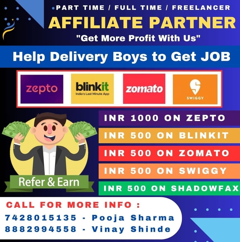 - Help Delivery Executives/Delivery Boys to get their JOB in Zepto/Blinkit/Zomato/Swiggy/Shadofax/Uber/Dominos/Flipkart and others